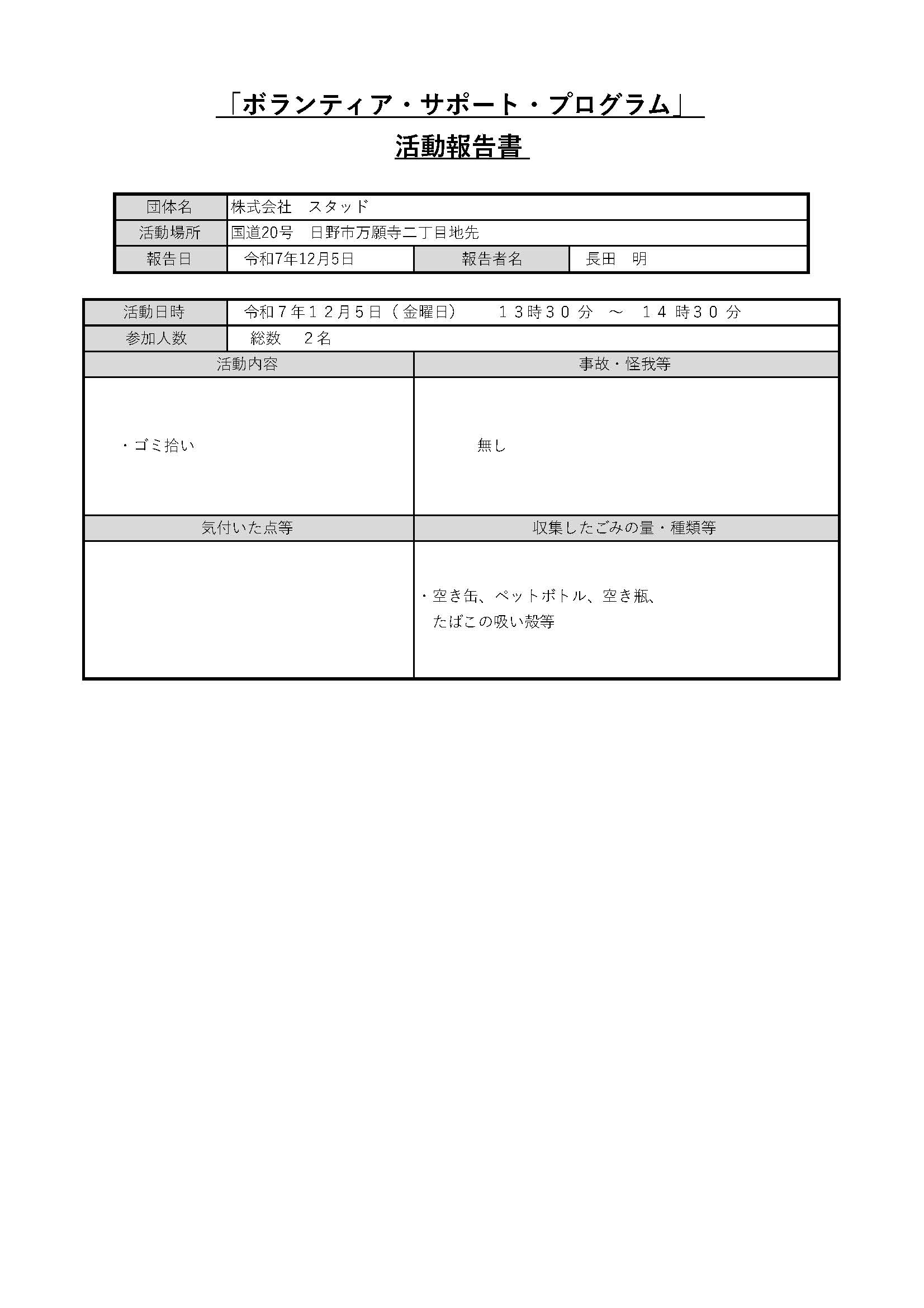 TOP > 新着情報一覧 > R7第4回ボランティアサポート(2025年12月5日) 2025/12/12 社会貢献 R7第4回ボランティアサポート(2025年12月5日) 過去のニュース 2025年12月 (1) 2025年10月 (1) 2025年9月 (3) 2025年8月 (1) 2025年1月 (2) 2024年9月 (2) 2024年8月 (1) 2023年12月 (1) 2023年10月 (1) 2023年7月 (2) 2023年6月 (5) 2022年5月 (1) 2022年1月 (1) 2021年10月 (1) 2021年9月 (1) 2021年8月 (2) 2021年6月 (1) 2021年5月 (1) 2021年2月 (1) 2020年12月 (2) 2020年11月 (1) 2020年9月 (1) 2020年6月 (1) 2020年1月 (1) ニュースカテゴリ お知らせ 採用情報 社会貢献 表彰